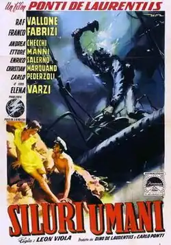 Siluri umani (internationally released as Human Torpedoes) is a 1954 Italian war film credited to Antonio Leonviola, who abandoned production and was substituted by director Carlo Lizzani (uncredited).[1] The movie depicts the successful WWII 1941 raid on Souda Bay in Crete by Italian Navy frogmen on the Royal Navy's HMS York heavy cruiser and a Norwegian oil tanker.