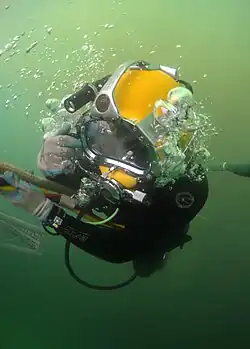 An open circuit breathing apparatus produces exhalation gas bubbles at the exhaust ports. Free-flow systems produce the largest volumes, but the outlet can be behind the viewports so it does not obscure the diver's vision. Demand systems must have the second stage diaphragm and exhaust ports at approximately the same depth as the mouth and lungs to minimise work of breathing. To get consistent breathing effort for the range of postures the diver may need to assume, this is most practicable when the exhaust ports and valves are close to the mouth, so some form of ducting is required to direct the bubbles away from the viewports of helmet or mask. This generally diverts exhaust gases around the sides of the head, where they tend to be rather noisy as the bubbles rise past the ears. Closed circuit systems vent far less gas, which can be released behind the diver, and are significantly quieter. Diffuser systems have been tried,[46] but have not been successful for open circuit equipment, though they have been used on rebreathers, where they improve stealth characteristics.[47]