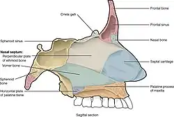 The wall separating the two cavities of the nose, the nasal septum, is made up of bone inside and cartilage closer to the tip of the nose.[3] The bony part is formed by the perpendicular plate of the ethmoid bone at the top, and the vomer bone below.[3] The floor of the nose is made up of the incisive bone and the horizontal plates of the palatine bones, and this makes up the hard palate of the roof of the mouth. The two horizontal plates join at the midline and form the posterior nasal spine that gives attachment to the musculus uvulae in the uvula.