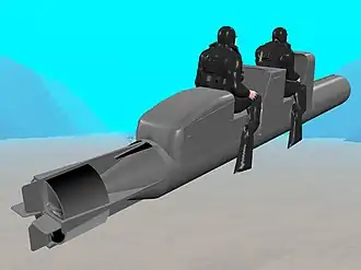 The first truly practical human torpedo was the Italian maiale,[2] electrically propelled by a 1.6 horsepower (1.2 kW) motor in most of the units manufactured. With a top speed of 3 knots (5.6 km/h), it often took up to two hours to reach its target. Two crewmen in diving suits rode astride, each equipped with an oxygen rebreather apparatus.[1] They steered the craft to the enemy ship. The "pig" could be submerged to 15 metres (49 ft), and hypothetically to 30 metres (98 ft), when necessary.[3] On arrival at the target, the detachable warhead was released for use as a limpet mine. If they were not detected, the operators then rode the mini sub away to safety.