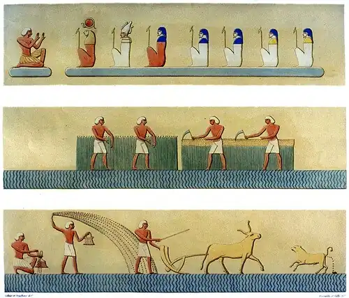 Agriculture, here showing cereal harvesting and ploughing using domesticated cattle, has been critical to human civilisation since the time of Ancient Egypt. Book of the Dead, spell 110: Fields of Iaru. Scene from tomb of Ramses III (1186–1155 BC)