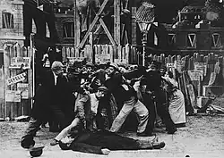The film's first ten episodes feature Cain and Abel, the Druids, Nero and Locusta, the persecution of Christians in the Roman Empire, the pillories of the Middle Ages, the Gibbet of Montfaucon, torture processes in the Middle Ages, Louis XIII, contemporary Parisian apaches, and the Hague Convention of 1907.[3] The Hague scene ends with the convention collapsing into chaos, with the delegates, who had convened to limit the power of armies, directly attacking each other. The eleventh and final scene, titled "Triumph", shows an Angel of Destruction hovering over a battlefield covered with dead and wounded soldiers.[4]