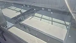 The station will be located below street level in an open trench running parallel to Highway 27. The station will have two street-level entrances, one entrance on the south side of Humber College Boulevard, the second further south facing a new street that will intersect with Highway 27.[1] The entrance structures will be at least 7.5 m (25 ft) in height, and will each face a plaza.[7]: 17 The centre platform will have several canopies for weather protection. The lack of a roof over the trench will allow natural lighting on the platform.[8]: 9 An exterior walkway with a 200-metre (660 ft) canopy will link the station to the Humber Polytechnic campus.[4][5] The station will have a bike room to accommodate 40 bicycles, two elevators for accessibility,[9] Wi-Fi and washrooms.[8]: 11