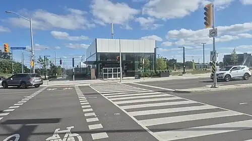 Humber College is a below-grade light rail transit (LRT) station that is under construction on Line 6 Finch West, part of the Toronto subway system. The station is located at the southwest corner of Highway 27 and Humber College Boulevard on the Humber Polytechnic North Campus in the Etobicoke district of Toronto. It will be the western terminus of Line 6.[3][1] A walkway will connect the LRT station to the nearby Humber College Bus Terminal.[4][5] The station's name refers to Humber Polytechnic's former name.[6]