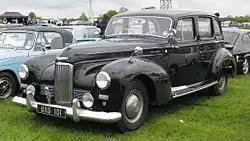 The Mark II announced in mid-September 1948 was mostly redesigned in chassis and body. Now a full six-seater with a bench-type front seat it was given a wider track and a variable ratio steering unit. The gear lever was now mounted on the steering column. Like Humber's Pullman the headlights were fitted into the wings and running-boards were re-introduced.[7] The transverse-spring independent suspension, first introduced on the Snipe and Pullman in 1935, continued but with 14 leaves instead of eight.[8]