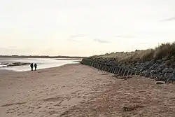 In the same year, the dunes were found to have been eroded by two thirds of their length because of strong waves. Around 260 tonnes of broken concrete and slag was used to shore up the weakest points and suggestions were made to further increase its stability, including building a higher and deeper sea wall between the dunes and the camp site, together with a clay bank on the beach.[55] Between 1961 and 1964 gabions and groynes costing £18,000 were built. However, within two years sand was scoured from the beach and the contents of the groynes washed out.[56]