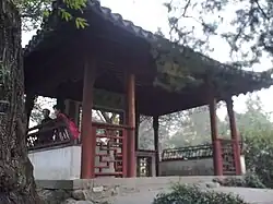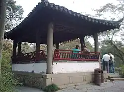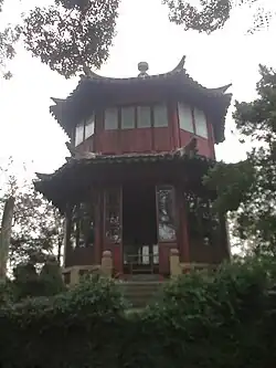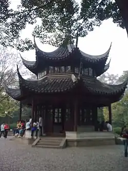 Also called the Pavilion of Exqusitiness, it is inspired by a verse by Su Shunqin, "Autumn drops in and tinges the dark woods red; moonlight pours down and grants the bamboo groves an exquisite look". It has a hipped gable roofline with flying eves. |