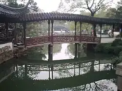 A covered bridge arched in three segments connected to a covered corridor on either end. It was designed to give the appearance of a rainbow shimmering when its reflection is stirred in the water. It is unique for being the only arched bridge in a Suzhou garden. |