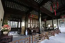 The main hall of the western garden. It is a typical mandrian duck hall but with four attached pavilions at the corners in Shanghai garden style. This hall was used for Kunqu Opera performances. |