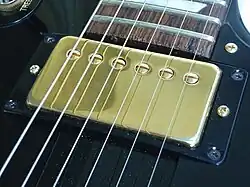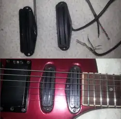 Humbuckers work by pairing a coil that has the north poles of its magnets oriented "up" (toward the strings) with another coil alongside it with the south pole of its magnets oriented up. By connecting the coils together out of phase, the interference is significantly reduced via phase cancellation: the string signals from both coils add up instead of canceling because the magnets are placed in opposite polarity.[9] This dramatically improves the signal-to-noise ratio. The technique has something in common with what electrical engineers call "common-mode rejection", and is also found in the balanced lines used in audio equipment. By convention, both humbucker coils are wound counterclockwise. The coils can be connected in series or in parallel in order to achieve this hum-cancellation effect, but humbucker pickups tend to be connected in series because that doubles the signal of the strings while keeping the hum reduced.[10] Some types of humbucker pickups can be manually split (with a switch or within the pickup selector) so that only one coil is active.