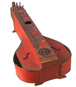 The hummel has many related forms. Common to all varieties is a flat top and bottom. There are variations in the type of wood it is made from, but the wood is always thin. On the top of the instrument are one or more soundholes. The strings vary in number, but often include a smaller number of melody strings and a greater number of accompanying strings. It is not uncommon to have three melody strings: two tuned identically, and the third tuned one octave below the others. Under the melody strings, either directly on the body or attached to a fretboard, are about 17 frets. The body comes in two main forms, either a pear-shaped form with the strings in the middle, or a half-pear with the strings near the edge.