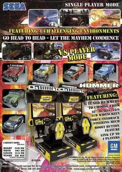Hummer is an arcade racing game released by Sega in 2009. The game runs on the Sega Lindbergh platform.[1] There are two game modes: Race Mode and Time Attack Mode. In Race Mode, players choose between 3 Hummers, each with an additional variant, to race against 20 opponents.[2][3] Two different variants of the cabinet feature two sets of controls side-by-side. This enables co-op play between players on the same cabinet using the "Driver Change System", which swaps the person controlling the vehicle at checkpoints or after collisions. Consequently, it is possible for up to 8 people to race at the same time, if the maximum of four 2-player machines are linked.[4] The game also features a boost meter, which can grant a speed boost when filled. The boost meter is increased by driving through destructible obstacles and landing controlled jumps.[1]