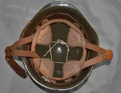 The shell is an exact copy of the Soviet SSh-40 design, the only difference being a unique liner among the copies produced among the Warsaw Pact nations of this helmet. The liner featuring four pads with multiple holes punched in them for ventilation, supposedly developed around 1965.[1] The pads being attached to a metal band covered in leather to the liner as opposed to the much simpler three separate pads attached directly to the liner of the SSh-40. The chin strap having a four-point design with a hook and catch assembly and a chin pad. The shell has a dark olive green paint that has anti-infrared protection, giving it a glazed sheen.