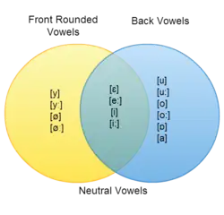 While /i/, /iː/, /ɛ/, and /eː/ are all front unrounded vowels, they are considered to be "neutral vowels" in Hungarian vowel harmony.[21] Therefore, if a word contains back vowels, neutral vowels may appear alongside them. However, if only neutral vowels appear in a stem, the stem is treated as though it is of front vowel assonance and all suffixes must contain front vowels.[20]
