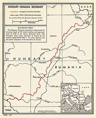 The Hungary–Romania border (Hungarian: Magyar–Román Államhatár; Romanian: Frontiera între Ungaria și România) refers to the state border between Hungary and Romania. It was established in 1920 by an international commission, the "Lord Commission", presided over by geographers including Emmanuel de Martonne and Robert Ficheux, and historians Robert William Seton-Watson and Ernest Denis. The border was set by the Treaty of Trianon which was signed on 4 June 1920.[1][2]