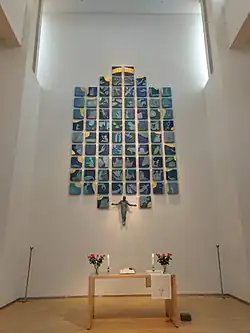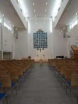 The church is rather unique in Norway because it is a part of a large building complex which includes a school, library, cafe, and leisure centre. The church cost about 84 million kr.