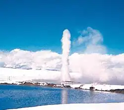 The geyser, still heavily promoted by the local Chamber of Commerce as a "must see" destination, stopped erupting for several years after June 2009, possibly due in part to the nearby geothermal development by the Town of Lakeview to supply the Warner Creek Correctional Facility with water for heating.[8] Proposed further development of the site for geothermal power generation purposes threaten the entire hot springs wetlands.[9] As of May 2015, it seems to be regularly erupting again.