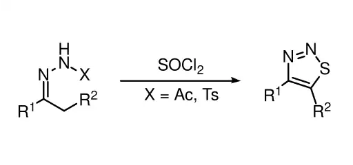 The Hurd–Mori 1,2,3-thiadiazole synthesis is a name reaction in organic chemistry that allows for the generation of 1,2,3-thiadiazoles through the reaction of hydrazone derivatives with an N-acyl or N-tosyl group reacted with thionyl chloride.[1][2][3][4] An analogous reaction gives 1,2,3-selenadiazoles by using selenium dioxide instead of thionyl chloride.[4]
