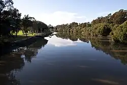 - A green belt along the entire southern border of the suburb. The belt follows the Cooks River and encompasses Ewen park. The Botany Bay cycle way[9] extends for 23 km (with Hurlstone Park being approximately one third of the way from Botany Bay to Ryde). The western part of the belt contains a constructed rectangular inlet of water named Boat Harbour. The eastern part of the belt constitutes part of the 13th and 14th holes of Marrickville Golf Course. There are three-foot bridges that cross the Cooks River to the south of the belt: One bridge crosses from the end of Sugar House Road (off Hutton Street), a second bridge crosses from the end of Foord Avenue, and the third bridge crosses near the intersection of Tennent Parade and Burnett Street.
