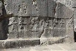 In the Hittite Empire Samuha served as one of the main centers of the worship of Hurrian deities.[134] Another major sanctuary was located in a rocky area near Hattusa, known today as Yazılıkaya (Turkish: "inscribed rock"), though it is uncertain if it can be considered a temple in the strict sense of this term.[135] The walls are decorated with reliefs of two processions of deities.[136] The goddesses follow Ḫepat, while the gods - Teššub, and the order of individual deities overlaps with the known kaluti lists.[136] The central relief depicts these two deities standing face to face.[136]