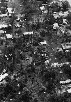 The Red Cross provided food and shelter to 63,000 people in the hurricane's wake, costing about $166 million (1983 USD; $524 million 2025 USD).[1][24] FEMA gave out $32 million (1983 USD; $101 million 2025 USD) to Alicia's victims and local governments; $23 million (1983 USD; $72.6 million 2025 USD) of that was for picking up debris spread after the storm.[25] More than 16,000 people sought help from FEMA's disaster service centers. The Small Business Administration, aided with 56 volunteers, interviewed over 16,000 victims, and it was predicted that about 7,000 loan applications would be submitted. The Federal Insurance Agency had closed over 1,318 flood insurance cases from Alicia's aftermath, however only 782 received final payment.[25]