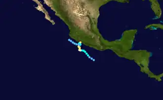 In anticipation for the storm, hurricane warnings were placed into effect along 175 mi (282 km) of coastline between the resorts of Zihuatenejo and Manzanillo.[4][5] Hundreds of people were evacuated prior to the passage of the hurricane.[6] Also, the Mexican government sent troops to the area to help with disaster relief, and the Michoacán state government sent five truckloads of bedding and medicines.[6] Prior to landfall, 14 inches of rain was expected.[7]