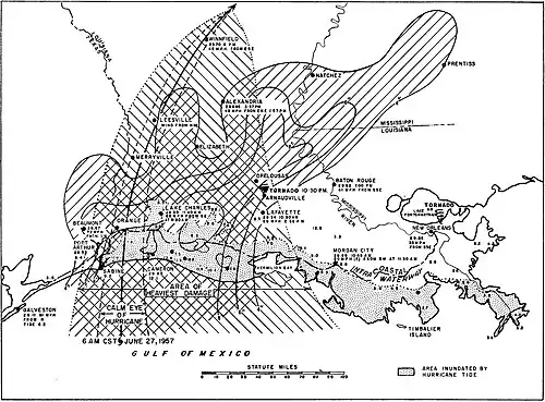 - ^ a b c d Meisler, Stanley (June 27, 1957). "Hurricane Veers, Hits Louisiana Coast". The Index-Journal. Vol. 65, no. 121. Greenwood, South Carolina. Associated Press. p. 1. Retrieved June 21, 2018 – via Newspapers.com.