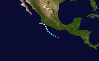 Following the classification of Tropical Depression Two-E on June 19, the Government of Mexico issued a tropical storm warning for coastal areas between Zihuatanejo and Manzanillo. A hurricane watch was also put in place from Tecpan de Galeana to Punta San Telmo.[5] Later that day, the tropical storm warning was upgraded to a hurricane warning and the watch was extended westward to La Fortuna.[18] As Beatriz continued to strengthen, the watches and warnings were extended westward to Cabo Corrientes on June 20.[19] Early on June 21, the easternmost advisories were discontinued as Beatriz moved away.[20] Later that morning, all watches and warnings were discontinued in light of Beatriz's rapid weakening.[21]