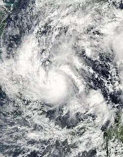 After maintaining its intensity for 30 hours, the shear weakened, and Beta began to intensify again.[4] Around 00:00 UTC on October 29, the storm passed near Providencia Island with winds of 70 mph (110 km/h), just below hurricane-status. At this time, the cyclone began to turn towards the west.[4][9] Beta intensified into a hurricane several hours later, with winds of 80 mph (130 km/h), as an eye became pronounced on infrared satellite images. Located south of a weakness within the subtropical ridge, the hurricane's motion slowed to a westward drift.[10] With the formation of an eye, the chances of rapid intensification reached 62%, and the storm could possibly become a major hurricane—a hurricane with winds of 111 mph (179 km/h) or higher—before landfall.[11] Beta continued to intensify as convection deepened around the 11.5 mi (18.5 km) wide eye,[12] strengthening into a Category 2 hurricane with winds of 105 mph (169 km/h).[4]