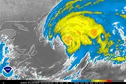 By the afternoon of August 23, up to 2.3 in (58 mm) of rain had fallen in southern Nova Scotia.[65] At least 32,000 residences in Nova Scotia had lost power due to the storm.[66] At the height of the storm, 45,000 people were without power and rainfall rates reached 1.2 in/h (30 mm/h). Several roads were flooded and overall damage was considered minor. Three people were injured by large waves and a gift shop and a home were badly damaged while a fish shed and breakwater were destroyed at Peggys Cove after being washed away by a 33 ft (10 m) wave.[67] Offshore, a buoy measured waves up to 85 ft (26 m).[68] Winds in Nova Scotia were recorded up to 50 mph (85 km/h) with higher gusts.[69]