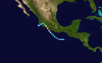 The tropical cyclone moved northwestward at 8 to 10 knots, and for the next two days its maximum sustained winds strengthened from 30 to 75 miles per hour (48 to 121 km/h). A ragged eye appeared on satellite imagery just before landfall on the afternoon of June 29, at a peak intensity of 90 miles per hour (140 km/h). The center crossed the south coast of Mexico midway between Lázaro Cárdenas, Michoacán, and Acapulco, Guerrero. Shortly after landfall, Boris weakened to a depression and turned southwestward in response to a building subtropical ridge to its north.[1] The system, thoroughly disrupted by the mountainous terrain of Mexico, dissipated on the July 1 after moving back over water just south of Puerto Vallarta.[1]