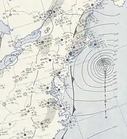 ![]() Weather map of Hurricane Carol off the east coast of the United States | |