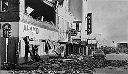 Damage in Langtry was very minor, reaching only $600.[26] A tornado in Port O'Connor, destroyed a 30 by 230 feet (9.1 by 70.1 m) boat storage shed, which was owned by Cooperative Weather Observed Bill H. Young.[10] In Refugio, a rancher observed wind gusts up to 142 mph (229 km/h). About $707,500 in damage occurred to property, while crop losses reached $425,000. One injury was reported after a person was struck by flying glass.[27] Wind gusts up to 160 mph (260 km/h) in Sandia damaged every house, 90% of cotton crops, and caused 1 fatality.[28] Although wind gusts of 168 mph (270 km/h) were observed in Taft, only $5 million in property and $500,000 in crop damages were reported.[29] In Tilden, the storm brought maximum sustained winds up to 100 mph (160 km/h). As a result, the entire city lost telephone and electrical services and there was "lots of damage" to trees, 80% of houses, and roofs. Property damage reached about $3.4 million, while there was also $25,000 in crop losses.[30] Property losses in Uvalde reached $100,000, while damage to crops was estimated at $250,000.[31] Additionally, a tornado was spawned in Yoakum, though it apparently caused negligible impact.[32]