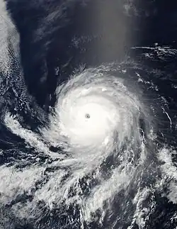 Although there were no factors inhibiting the development of Celia, the storm unexpectedly weakened again later on June 23. The storm's eye rapidly dissipated and the central dense overcast became asymmetric. Forecaster Todd Kimberlain at the NHC referred to the unexplained shifts in strength as "puzzling."[17] However, as suddenly as the weakening took place, strengthening ensued. Very strong convection formed over the center of the storm, with some cloud tops being as cold as −86 °C (−123 °F), but no eye had reformed by the morning of June 24.[18] Throughout the day, Celia became increasingly organized, with the eye fully reforming and the structure becoming more symmetrical.[19] Rapid intensification soon followed as the storm reached Category 4 status,[20] becoming one of only a handful of tropical cyclones to do so during the month of June in the eastern Pacific.[21] That evening, the storm further intensified into a Category 5 hurricane, the second storm to reach this strength during June in the Eastern Pacific basin on record.[22] Hurricane Celia attained its peak intensity around 00:00 UTC, with sustained winds of 160 mph (255 km/h) and a barometric pressure estimated at 921 mbar (hPa; 27.20 inHg).[1] The storm also displayed a well-defined eye estimated to be 17 to 23 mi (27 to 37 km) in diameter.[23]