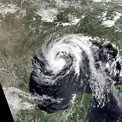 One fatality was reported during an oil rig evacuation in the Gulf of Mexico. Ten other people perished when a lifeboat capsized south of Morgan City, Louisiana. Four others on the boat were rescued by the United States Coast Guard.[8] In Louisiana, high tides were only reported at one location, with seas reaching about 4.2 feet (1.3 m) in Cameron. Winds in the state were also light, with the highest sustained wind speed being 29 mph (47 km/h) along the Lake Pontchartrain Causeway, while the strongest gust was approximately 42 mph (68 km/h) in New Orleans.[13] Rainfall was mostly minimal throughout the state and mainly less than 3 inches (76 mm), while the highest total recorded as 3.84 inches (98 mm) in Amite City.[14] A tornado touched down in Acadia Parish, where it downed trees and removed a mobile home from its foundation. The only known impact in Mississippi was tides of 2.6 feet (0.79 m) above mean sea level.[5]