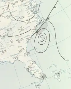 ![]() A daily weather map for July 8, 1959, depicting Hurricane Cindy approaching South Carolina | |