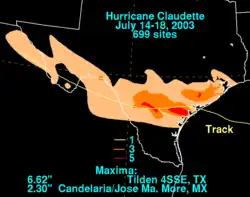 - ^ James Franklin (July 15, 2003). "Tropical Storm Claudette Discussion Number 26". National Hurricane Center. Retrieved February 18, 2025.