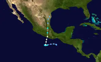 During the night of June 21, Cosme made landfall just east of Acapulco. It moved inland and quickly deteriorated, weakening into a tropical storm shortly after coming ashore.[2] It trekked northward through eastern Mexico and further diminished into a tropical depression before becoming indistinguishable south of Brownsville, Texas on June 23. Tropical Storm Allison's development in the Gulf of Mexico was partially related to residual conditions from Cosme's remnants.[1]