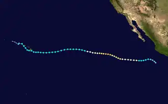 Tracking steadily west-northwestward along the southern periphery of a subtropical ridge, Darby continued to intensify albeit at a slower rate due to its proximity to dry air.[1] On July 15, Darby became a Category 2 hurricane on the Saffir–Simpson hurricane wind scale.[9] Despite decreasing ocean temperatures, Darby intensified further to attain winds of 105 mph (169 km/h).[10] Strengthening was no longer expected as Darby moved over sea temperatures of less than 79 °F (26 °C), but on July 16, Darby managed to develop an annular structure. Convection became more symmetric, outer rainbands dissipated, and the 25 mile-wide (35 km) eye became increasingly well defined.[1][11] Darby reached its peak intensity as a Category 3 hurricane with winds of 120 mph (190 km/h) and a minimum pressure of 958 mbar (958 hPa; 28.3 inHg).[1] However, twelve hours later, Darby weakened back to a Category 2 hurricane as convection deteriorated.[1] Embedded in cool sinking air and moving over decreasing sea surface temperatures,[12] Darby began a gradual weakening trend, degrading to a Category 1 hurricane by July 18.[1] Despite warming cloud tops, Darby exhibited a well-defined circulation and a ragged eye feature, remaining a minimal hurricane through the rest of the day.[13] However, Darby finally weakened to a tropical storm on July 19.[14] Darby continued to degrade as it crossed 140°W into the Central Pacific, and entered the jurisdiction of the Central Pacific Hurricane Center (CPHC) on July 20 with winds of 60 mph (97 km/h).[15]