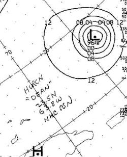 ![]() Dean near peak intensity just south of Bermuda on August 6 | |