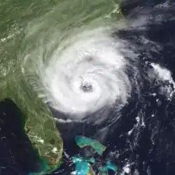 Tracking west-northwestward in advance of a trough over the eastern United States, the system did not resemble a typical hurricane on satellite imagery, with a low-level center outside of the deepest convection.[3] The system turned towards the northwest and simultaneously slowed in motion by August 27 as a second mid-latitude trough passed to its north. Though wind shear remained unfavorable initially, it began to lessen on August 28 as an anticyclone developed aloft. At 12:00 UTC, Dennis was upgraded to a Category 2 hurricane on the Saffir–Simpson scale and reached peak winds of 105 mph (165 km/h), though its lowest barometric pressure was recorded until 06:00 UTC on August 30. Despite this intensity, the hurricane's eye was large, up to 30-40 mi (50–65 km) wide, and several fixes from the Hurricane Hunters did not indicate the presence of one at all. The system also became unusually large, with its radius of maximum sustained winds extending up to 70-85 mi (110–130 km) wide. Following peak intensity, Dennis accelerated towards the northeastward in response to the secondary trough, barely missing the Outer Banks. By August 31, steering currents collapsed and the hurricane began to aimlessly drift east of Cape Hatteras, North Carolina.[2]