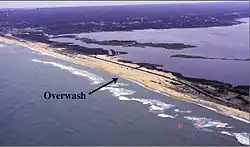 Storm surge left three towns on Hatteras Island isolated from the rest of the state as an 8 ft (2.4 m) deep channel was created on North Carolina Highway 12. Additionally, storm surge cut-off the route between Avon and Buxton and left 4 ft (1.2 m) of sand lying upon portions of Highway 12.[16] In Carteret, Craven, and Dare counties, the storm damaged at least 2,025 homes and businesses to some degree. The storm brought major damage to 75 homes and minor damage to 230 others in Carteret County. Tides along the Neuse River ranged from 8 to 10 ft (2.4 to 3.0 m) above normal, flooding homes near Adams, Clubfoot, and Harlowe creeks,[17] including between 100 and 150 dwellings in Harlowe.[18] The county also suffered agricultural losses, totaling about $3.5 million. A total of 120 dwellings in Craven County experienced substantial damage.[17]