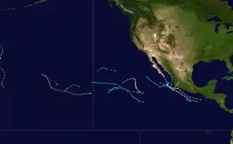 On July 24, the SS Pacificus encountered a storm with maximum sustained winds meeting the threshold of tropical storm status roughly 1,000 mi (1,600 km) west of the Baja California Peninsula.[1] Despite reports that the location of the system remained vague, the Joint Typhoon Warning Center (JTWC) began issuing tropical cyclone advisories and warnings on the unnamed disturbance.[2] Tracking west-northwestward, the tropical storm peaked with winds reported at 65 mph (105 km/h) shortly after its discovery; however, the JTWC discontinued its monitoring of the cyclone on July 27 due to a lack of ship reports confirming the location of the tropical storm.[1]