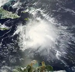 While passing south of the Dominican Republic on August 1, the system became much better organized, producing tropical storm-force winds in its northern periphery.[11] The fast forward motion allowed the system to develop despite an increase in upper-level wind shear, although the shear decreased as water temperatures increased along the wave's path.[12] A Hurricane Hunters mission was scheduled to fly into the system on August 1, but it could not investigate because of mechanical problems.[13] Early on August 2, the system passed south of Jamaica,[14] and a Hurricane Hunters flight was able to observe a closed circulation. As a result, the NHC classified the system as Tropical Storm Earl at 16:00 UTC that day, located 215 mi (350 km) south-southeast of Grand Cayman and situated between Jamaica and northeastern Honduras.[15]