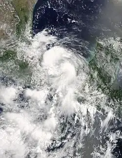 Moving over the Yucatán Peninsula and across the mountainous terrain of northern Guatemala, Earl quickly weakened; its convection diminished, although its circulation remained well-defined.[22] By late on August 4, the convection was limited to a small area southeast of the center, and close proximity to land was expected to limit development.[23] On August 5, most of the circulation of Earl emerged into the southern Bay of Campeche.[24] Later that day, a Hurricane Hunters mission indicated that the storm re-intensified and had sustained winds of 60 mph (95 km/h), reporting flight-level winds of 68 mph (109 km/h).[25] At 02:00 UTC on August 6, Earl made its final landfall just south of Veracruz. The storm rapidly weakened over the mountains of eastern Mexico,[26] and the circulation dissipated by 15:00 UTC. Moisture from the storm interacted with a disturbance on the Pacific coast of Mexico,[27] which the NHC monitored as an area for development and soon developed into Tropical Storm Javier.[28]
