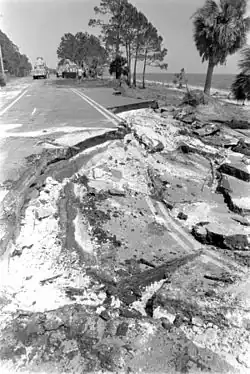Elena's track parallel to the Florida Panhandle subjected the coastline between Apalachicola and Pensacola Beach to particularly severe conditions that resulted in "significant" property damage there.[73] In Apalachicola proper, winds tore large roofs off buildings,[74] and data from Florida's Department of Natural Resources indicate that 20 residences and one community building in Franklin County were damaged or destroyed.[75] Structural failure was prevalent along the county's waterfront and on islands such as Dog Island; however, it was mainly limited to poorly constructed buildings.[72] Several miles of roadways in the county sustained significant damage, and about 1⁄2 mile (800 m) of bulkhead was destroyed.[75] Low seawalls allowed crucial points of the causeway to St. George Island to erode, causing it to fail.[72] In Escambia County, the hurricane left $2 million in damages. Throughout much of the remainder of the Florida Panhandle, structural damage was limited, though 100,000 people in the Pensacola area lost power.[76] The configuration of the southern tip of Cape San Blas in Gulf County was changed by the storm.[77] The hurricane wiped out eagle nests, generated freshwater fish kills, and affected other species of wildlife at the St. Vincent and St. Marks National Wildlife Refuges.[56] St. George Island and Honeymoon Island State Parks were heavily affected, with appreciable but lesser damage in numerous other protected areas.[78] U.S. Route 98, which closely follows the coast in this region, required extensive repairs after being undermined in nearly two dozen locations.[79]