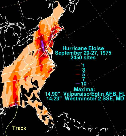 - ^ a b c d Roth, David (October 3, 2006). "Hurricane Eloise - September 14–27, 1975". Hydrometeorological Prediction Center. Archived from the original on September 21, 2013. Retrieved November 10, 2009.