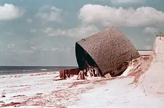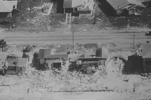The storm caused severe beach erosion in Bay County; approximately 801,000 cubic yards (612,000 m3) of sand was removed.[16] Storm-related changes in the coastal topography resulted in extensive structural damage in the Panama City Beach area. The most severe damage was concentrated in a 22 miles (35 km) area of the shore east of the hurricane's eye, and storm surge peaked in intensity for no more than a half hour according to preliminary estimates. Much of the resultant damage came as a result of foundation undermining, which was compared to that of the New England hurricane of 1938. Although Eloise was not abnormally strong, the geographical setting and building standards in the area were blamed for the destruction of many homes and businesses.[17] Monetary losses from property damage in Panama City Beach alone totaled about $50 million.[18]