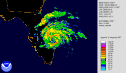 The storm left mostly minimal impact in South Florida, with wind gusts just barely reaching tropical storm-force. Much of the Miami metropolitan area observed 2 to 6 in (51 to 152 mm) of rainfall, causing only minor flooding. Along the coast of Palm Beach County, minor to moderate beach erosion occurred. Rough seas caused a 55 ft (17 m) ketch to run aground near Riviera Beach, necessitating the rescue of six people.[39] In the Treasure Coast – Indian River, Martin, and St. Lucie counties – the storm produced sustained winds up to 86 mph (138 km/h) at the Sebastian Inlet. Although no wind gust was reported from the inlet, Vero Beach recorded a wind gust of 70 mph (110 km/h).[1] Despite being directly struck by the hurricane, the three-county region and the adjacent inland counties of Okeechobee and southern Osceola did not experience significant impact, with effects mainly limited to downed trees and signs and minor flooding.[40] The storm damaged two homes in Indian River County.[41] Only 17,000 businesses and homes in Indian River, Martin, and St. Lucie counties combined lost electricity.[36]