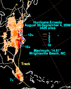 - ^ a b David Roth (2007). "Rainfall Summary for Hurricane Ernesto". Hydrometeorological Prediction Center. Retrieved February 24, 2008.